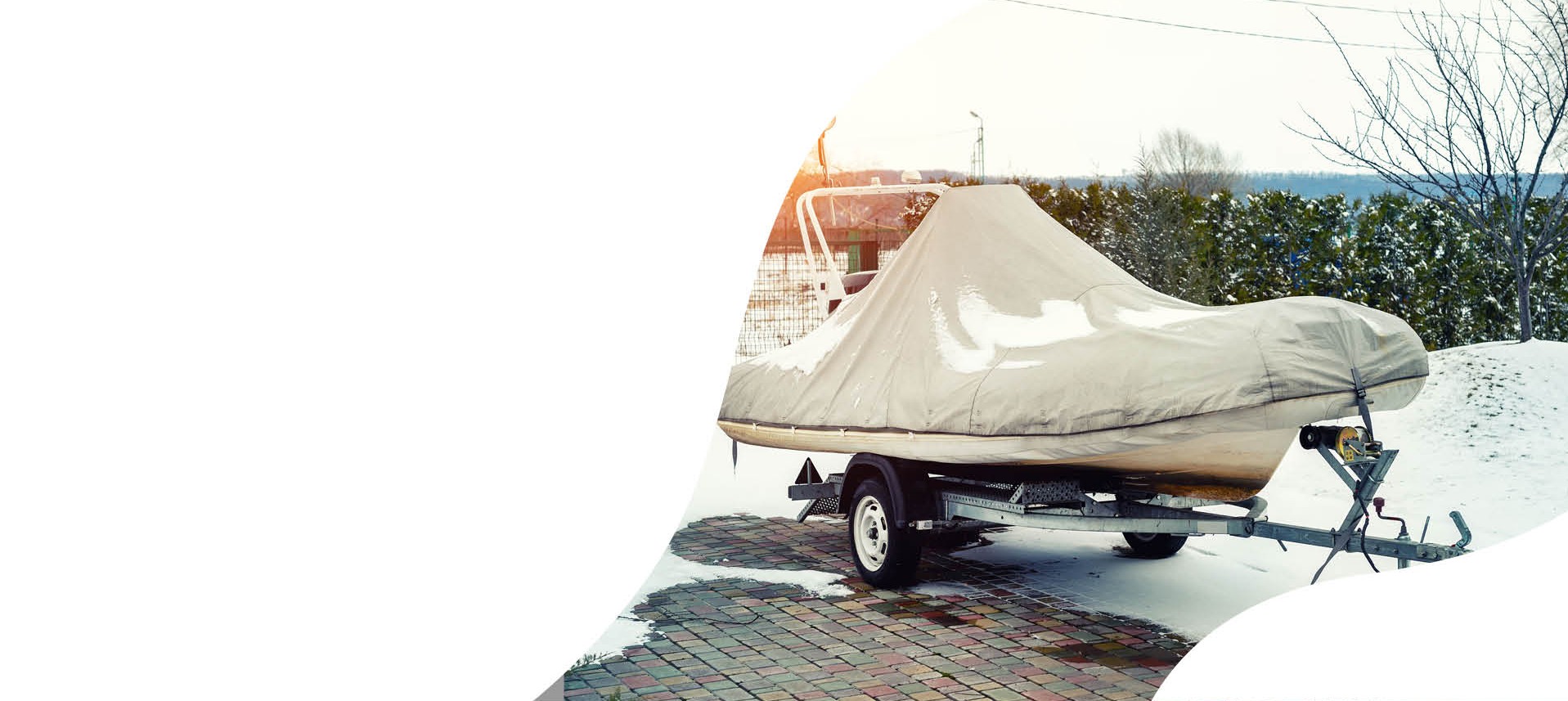A covered boat on a trailer, parked for the season, showcases proper RIB winterising on a snowy driveway by the hedge.